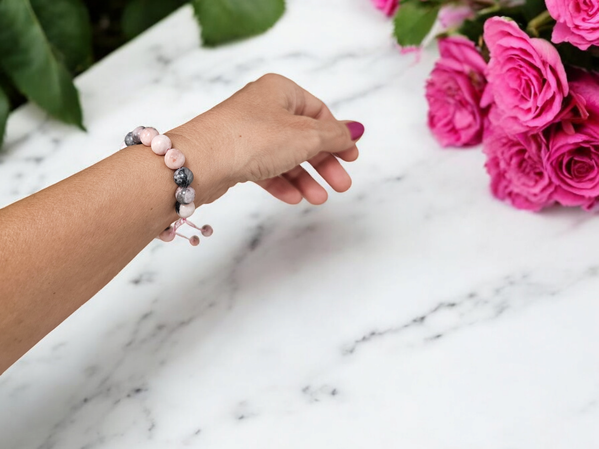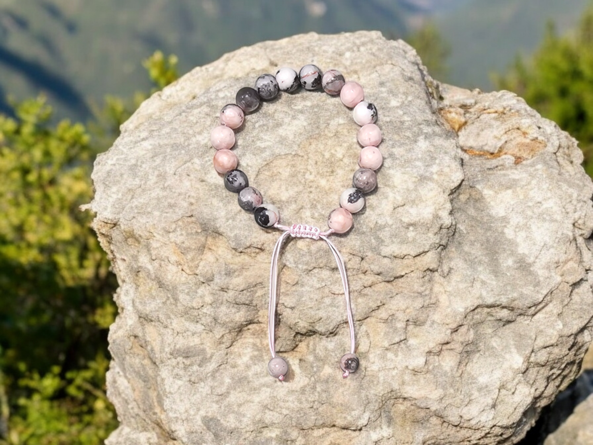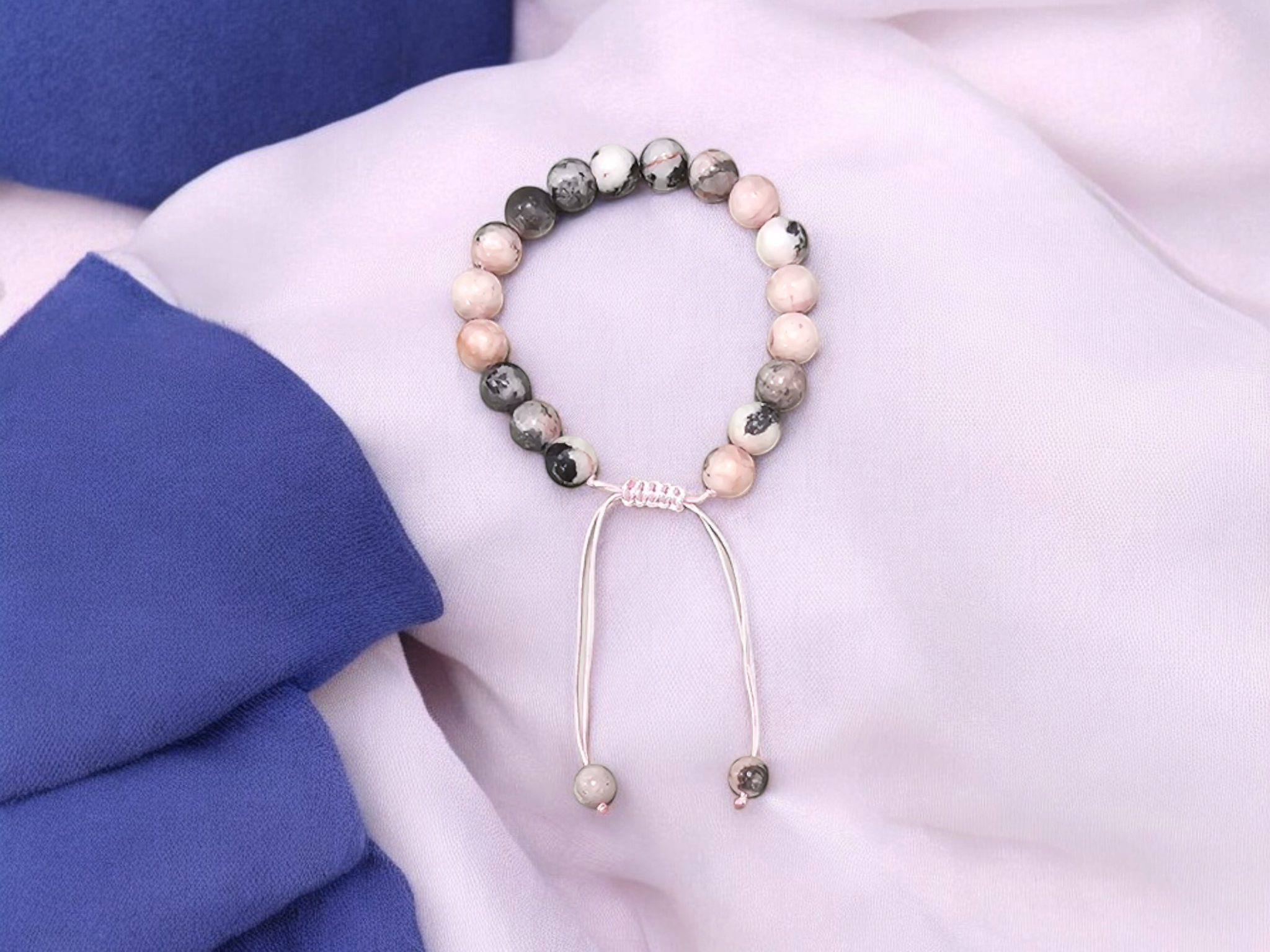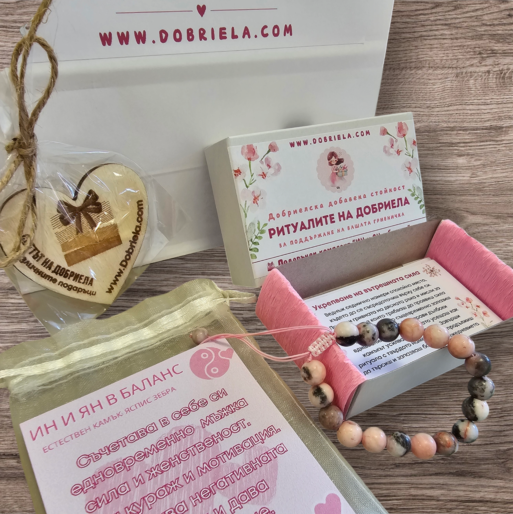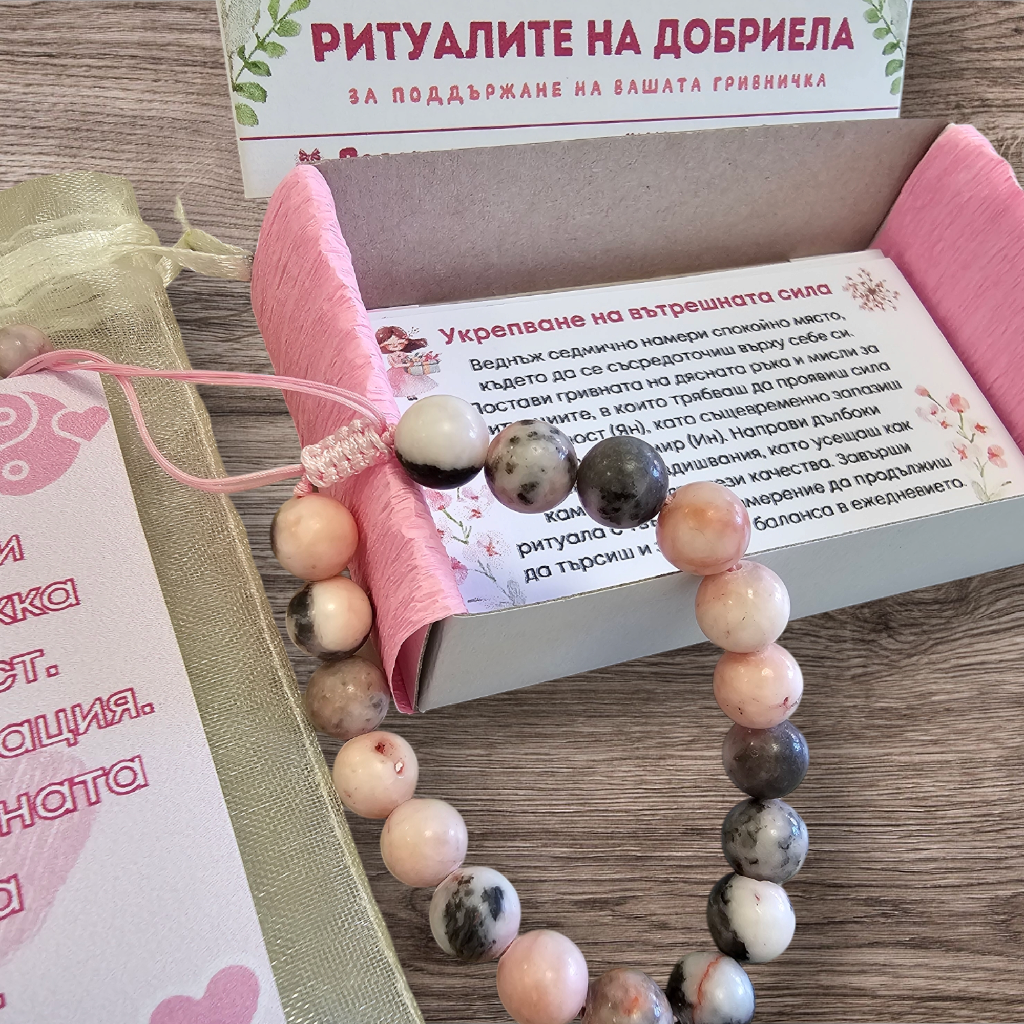 Гривна от Яспис зебра - Изработена от естествен камък, тази гривна съчетава нежния розов цвят с тъмно сиви елементи, символизиращи перфектния баланс между Ин и Ян. Камъкът Яспис зебра е известен със своята уникална красота и способност да обединява противоположностите. Той е камък на баланс и хармония, който помага за обединяване на мъжката сила и женствеността в една цялостна и могъща хармония.