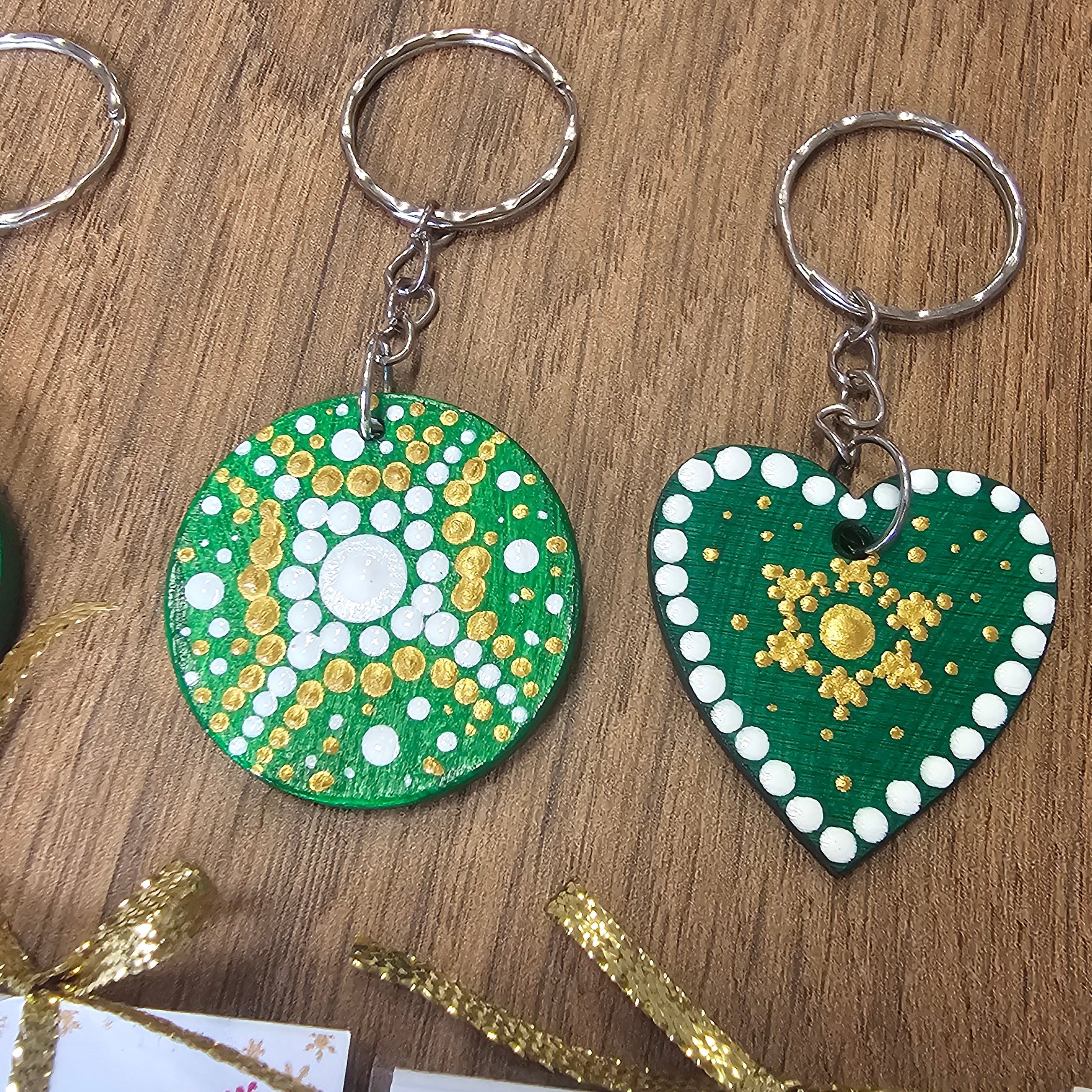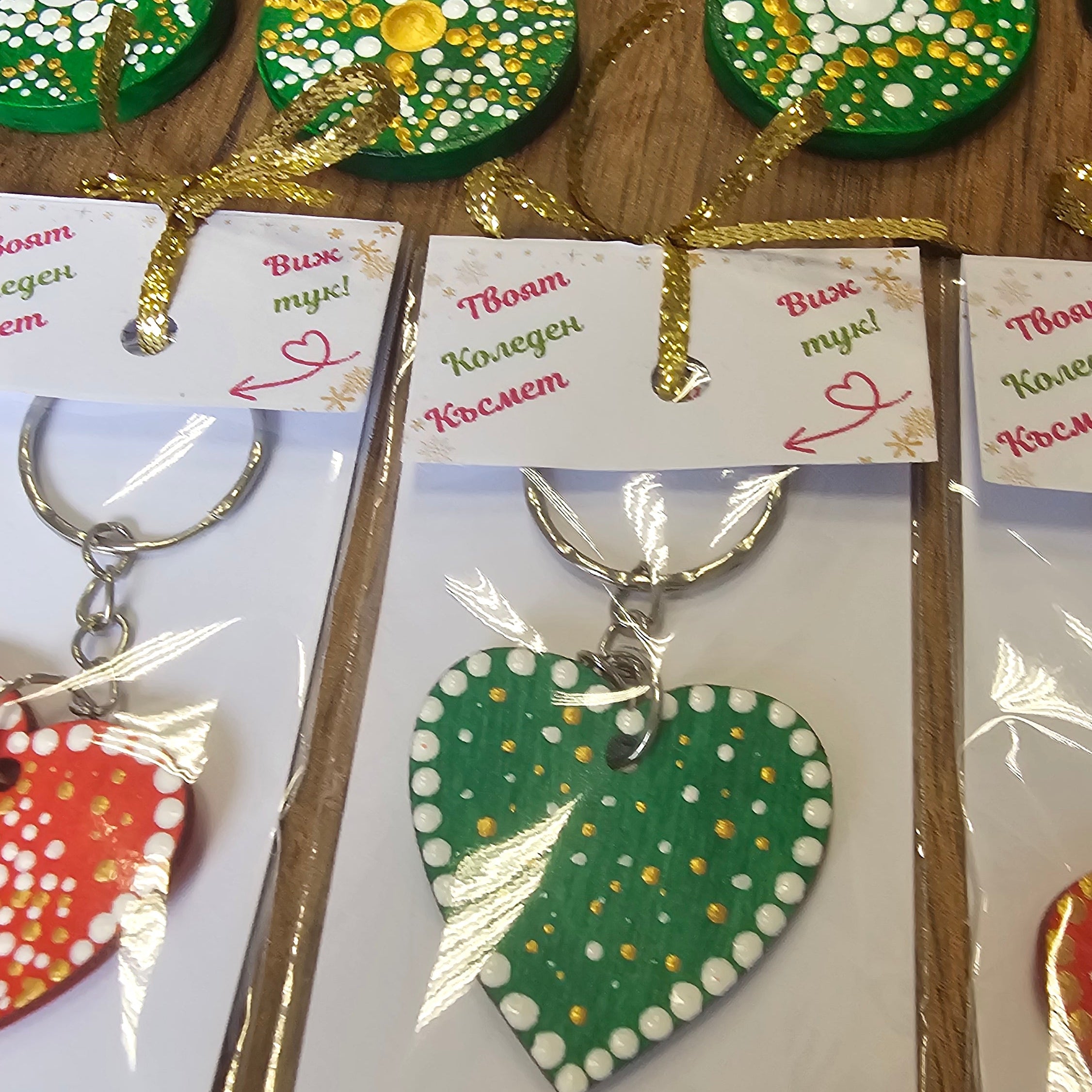 Изработен от естествено дърво във форма на сърце или кръг, всеки ключодържател е ръчно изрисуван с уникална коледна рисунка. Няма два еднакви! Цветовете, детайлите и фината изработка превръщат всяко ключодържателче в мини произведение на изкуството.