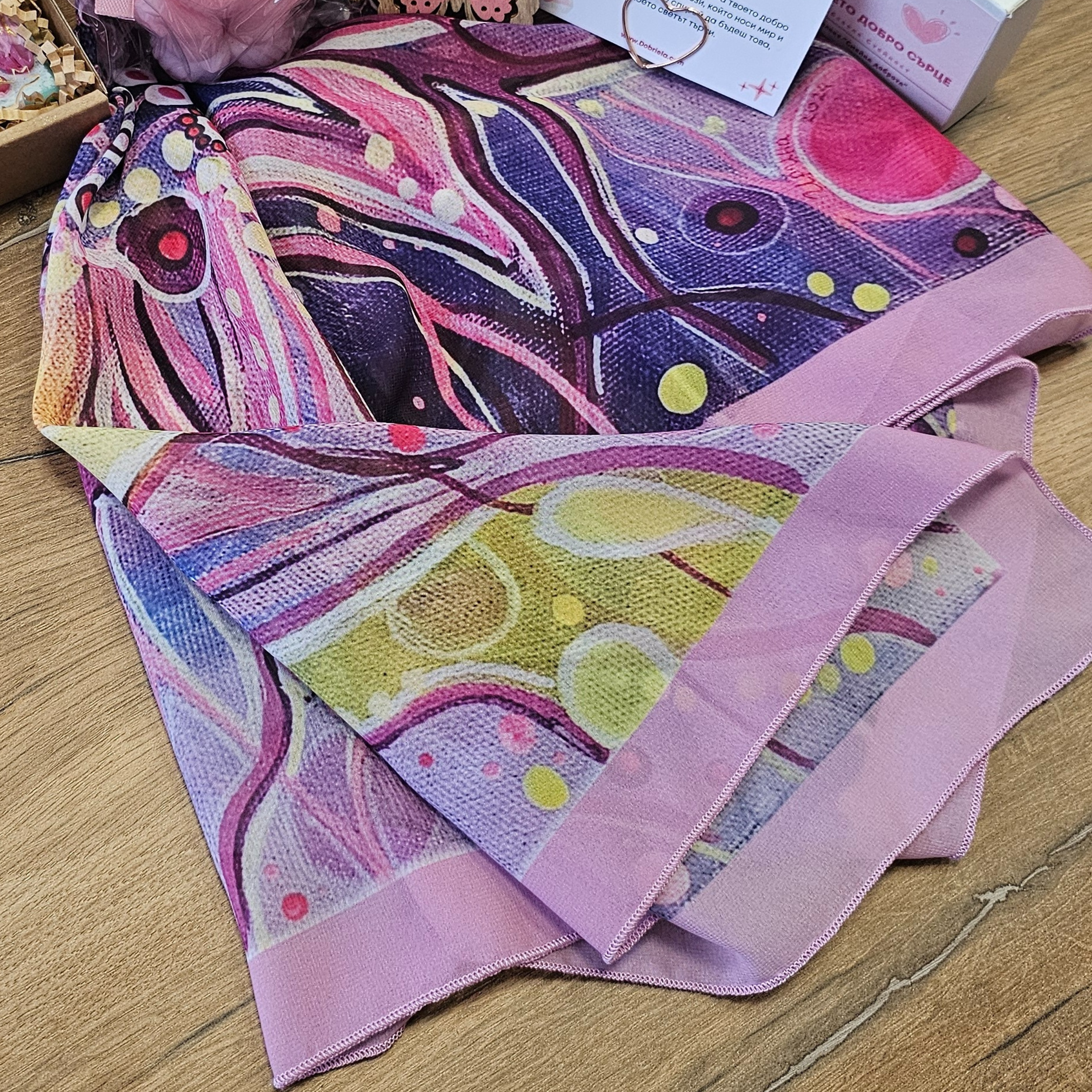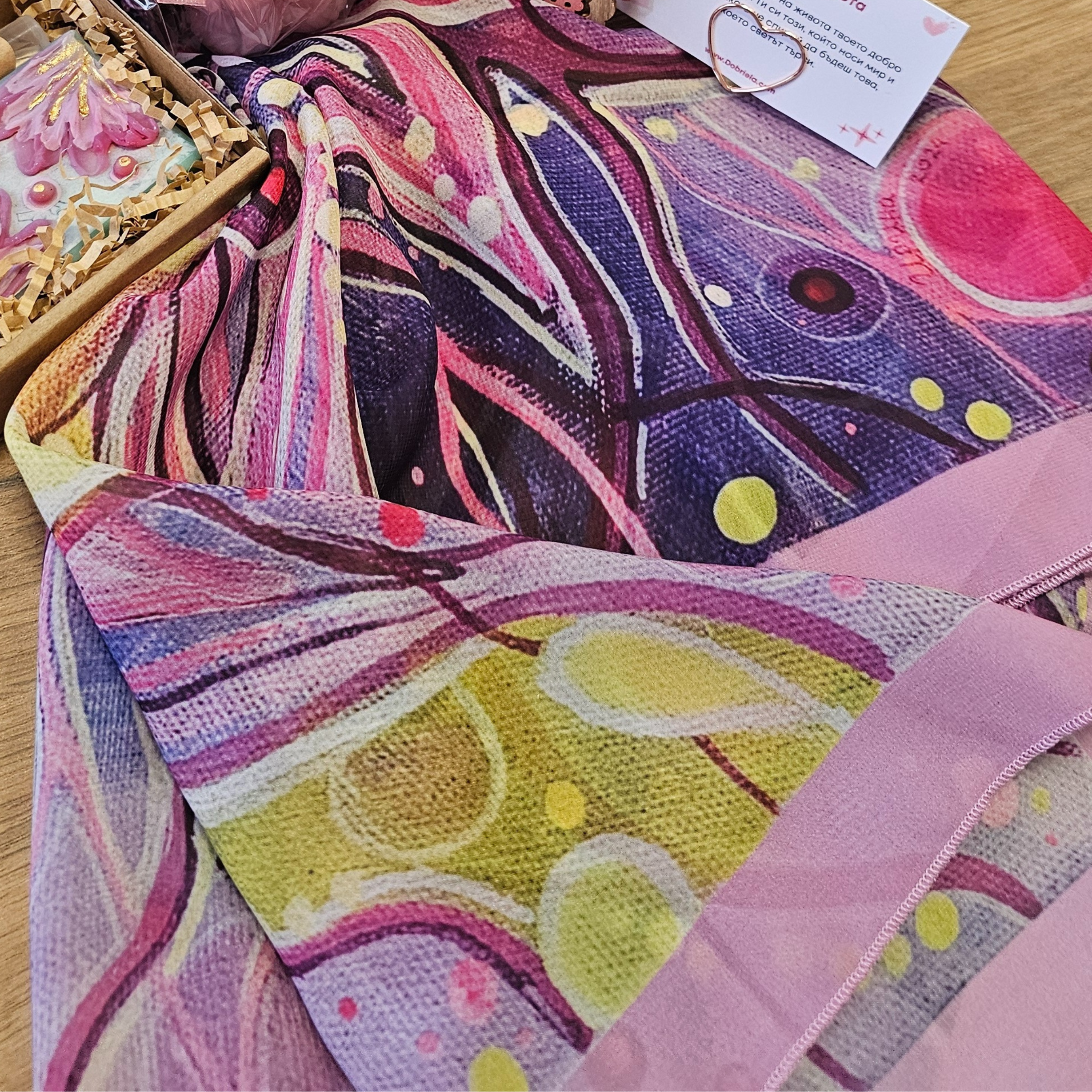 Елегантен шал с авторска картина на старозагорската художничка Ирина Колева, носеща името на подаръка. Този шал не е просто аксесоар, а символ на светлината и добротата, които носим в себе си. Лек и изящен — той обгръща с топлина и вдъхновение.