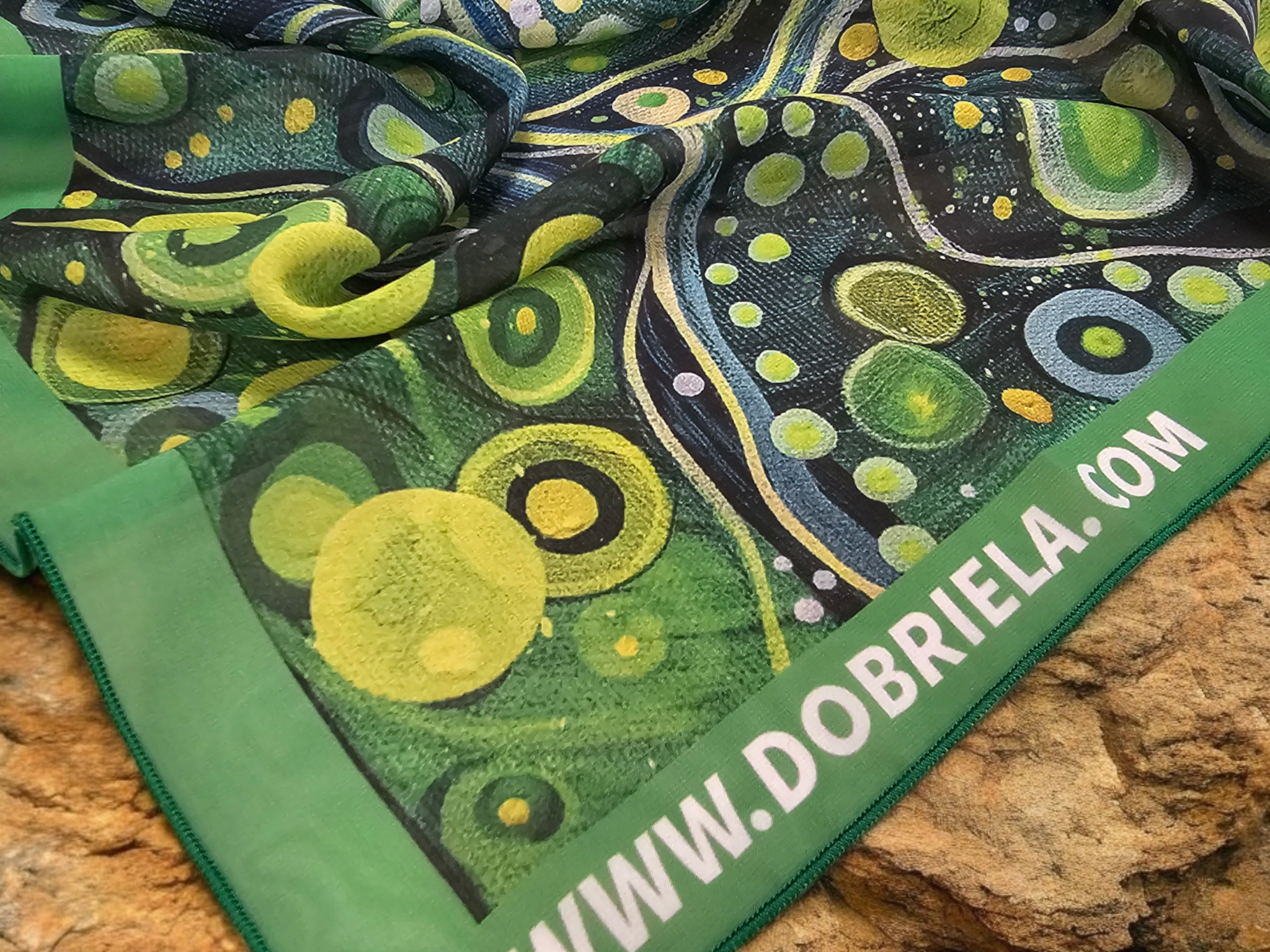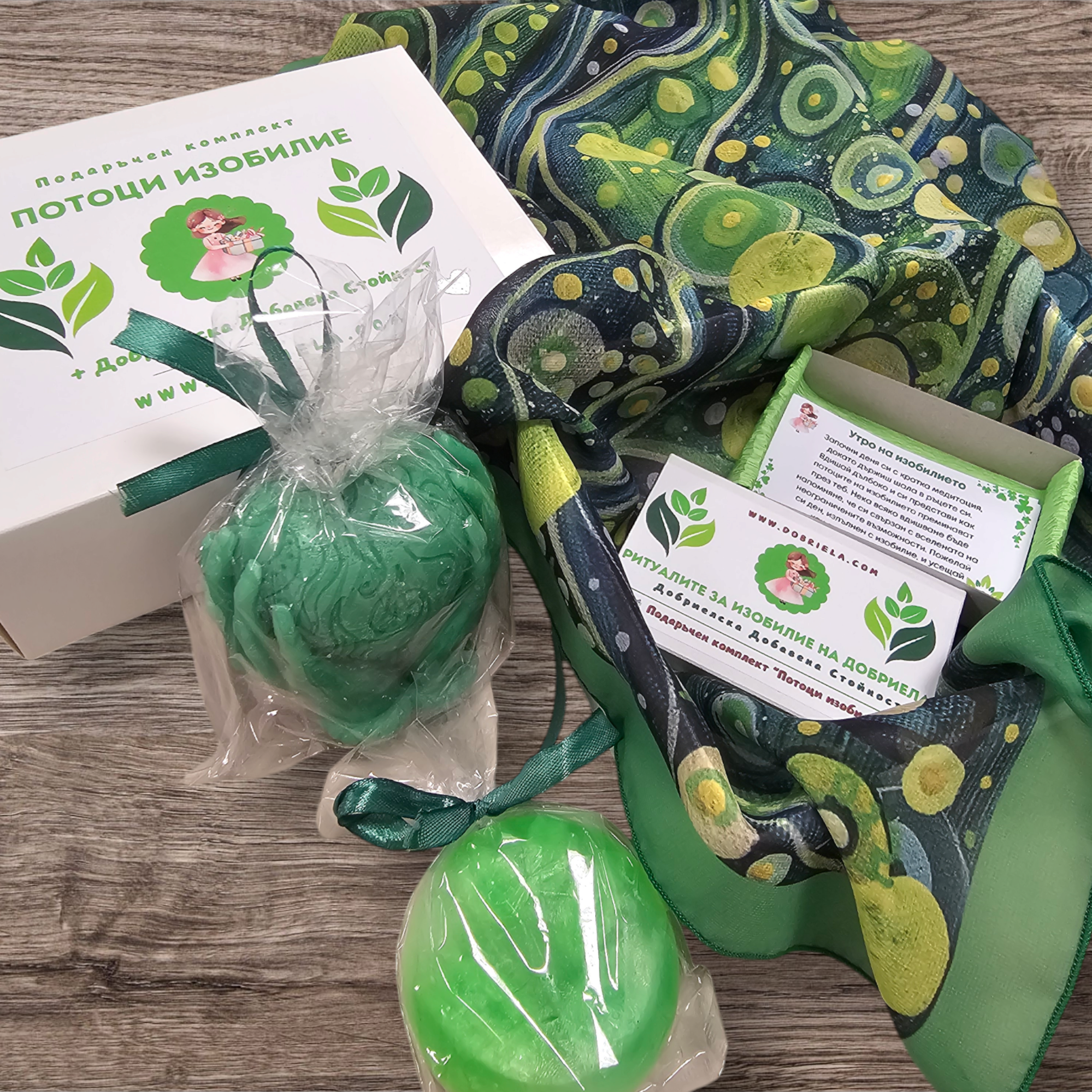 - Ефирен шал (65х65 см) с уникален дизайн, създаден по авторската картина "Потоци изобилие" на художничката Ирина Колева. Шалът е в зелени нюанси, символизиращи растеж и просперитет.
