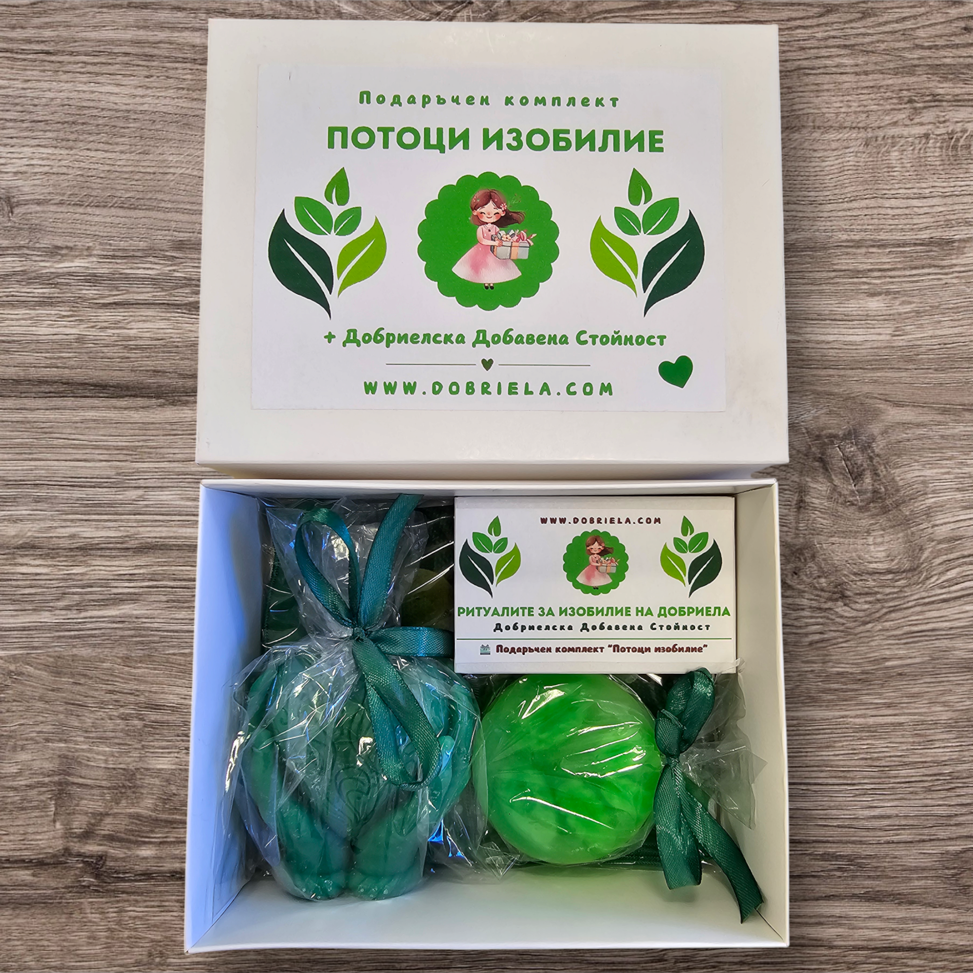 Подаръчният комплект "Потоци изобилие" е съвършен жест за тези, които искат да живеят в потока на изобилието и да го привлекат във всички аспекти на живота си. Вдъхновен от природата и нейните неизчерпаеми дарове, този комплект е елегантен начин да дарите или получите символи на просперитет и хармония.