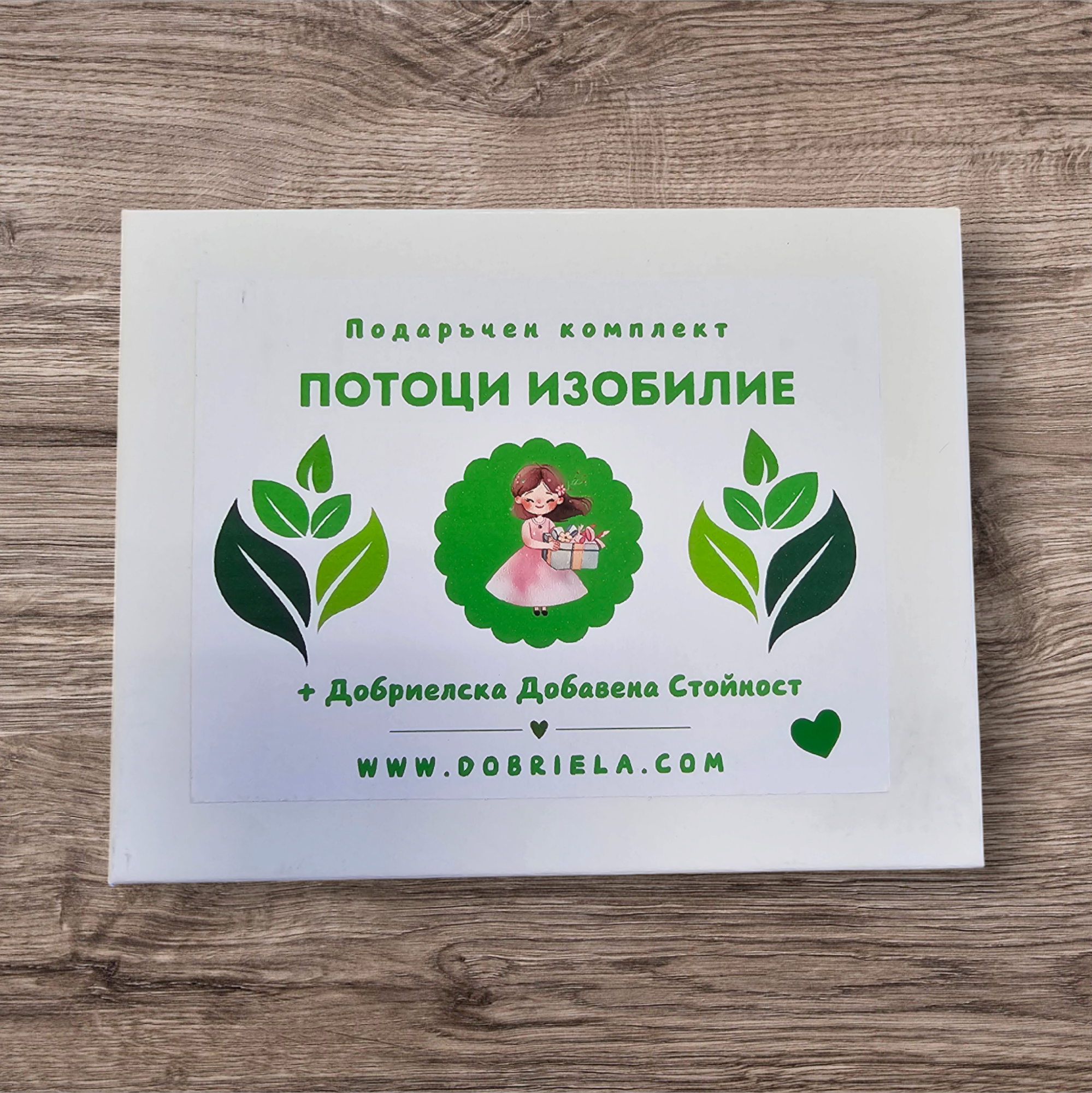 Но това не е всичко! Специалното допълнение към този комплект е "Добриелската добавена стойност" – малка кутийка, съдържаща вдъхновяващи идеи как да привличате изобилие във всеки аспект на живота си. Тези малки напомняния ще ви насочват към вътрешен баланс и хармония, така че да живеете в изобилие и да го създавате около себе си.