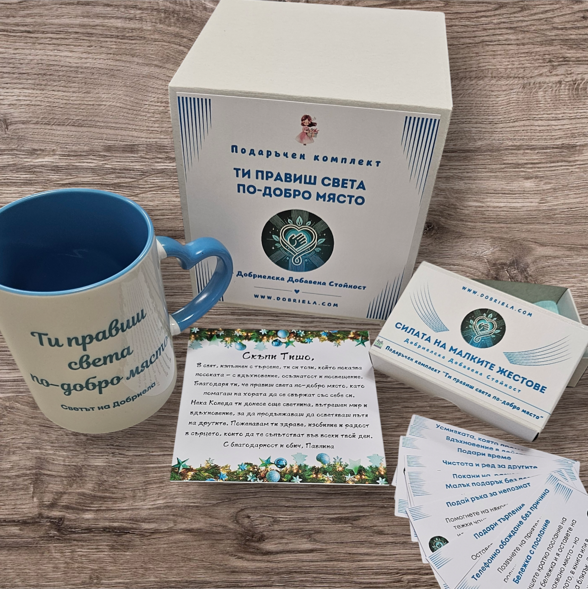 Искате ли да изразите своята признателност към мъж, който ви е вдъхновил със своите добри дела или грижа към другите? Подаръкът "Ти правиш света по-добро място" е специално създаден, за да покаже колко цените неговите усилия. Този елегантен и стилен комплект съчетава функционалност, вдъхновение и персонално отношение – идеален избор за мъж, който заслужава вашата благодарност.